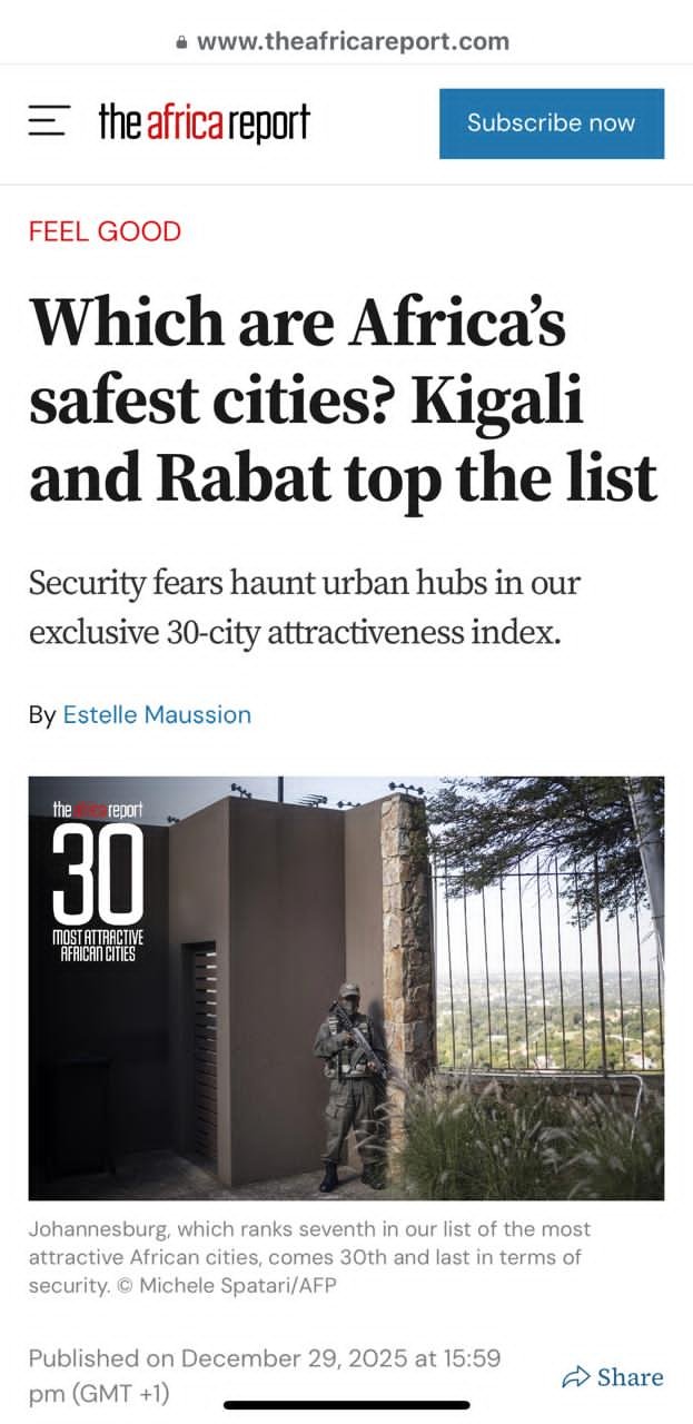 تصدرت العاصمة الرواندية كيغالي قائمة المدن الافريقية الأكثر أمناً لعام 2025م وفق التصنيف السنوي لموقع “ذي أفريكا رييورت”، ويشير التصنيف إلى وجود علاقة قوية ما بين جاذبية المدن وشعور المواطن بالأمان.