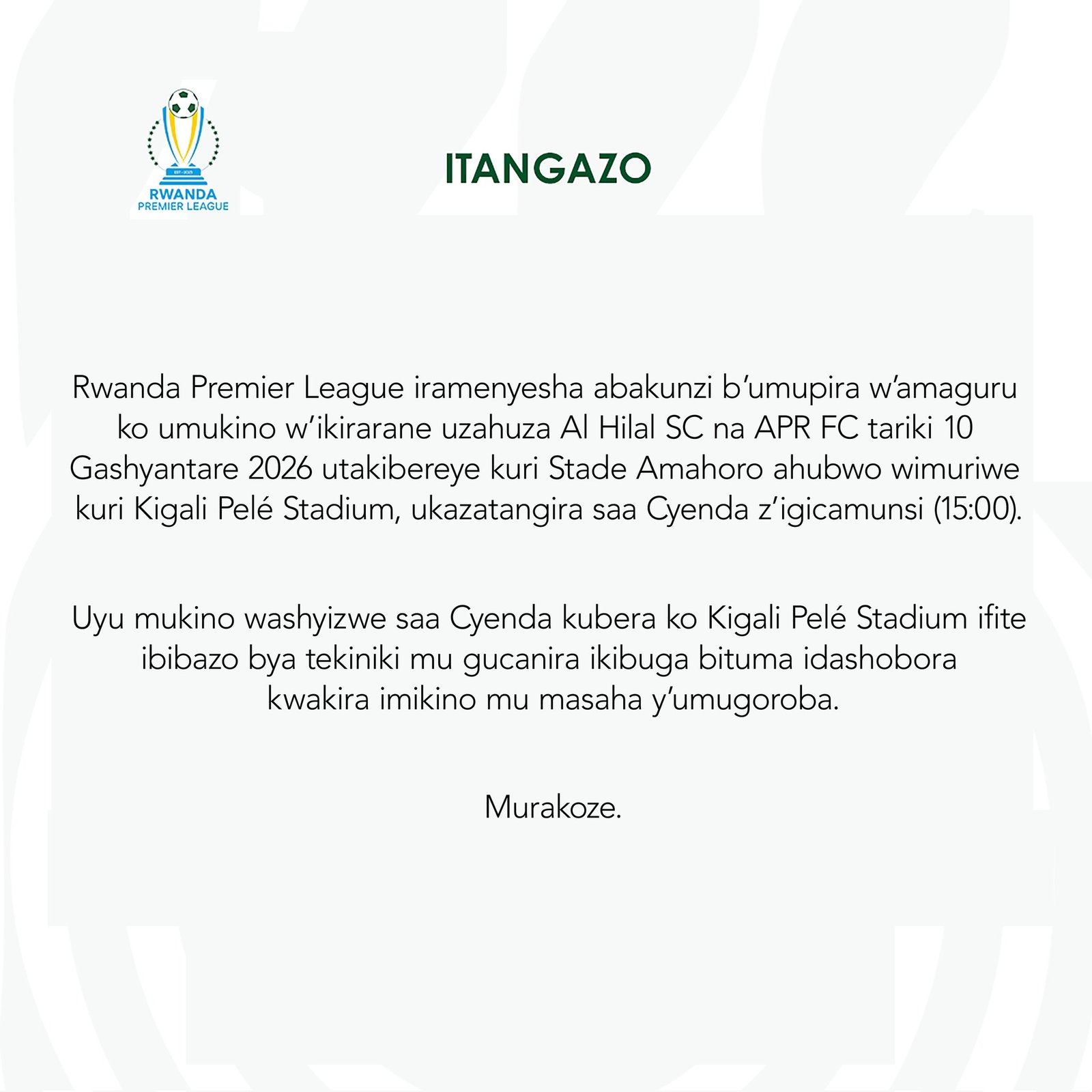 أعلنت رابطة الدوري الرواندي الممتاز نقل مباراة الهلال وAPR المقررة يوم 10 فبراير 2026 من ملعب أماهورو إلى ملعب كيغالي بيليه.