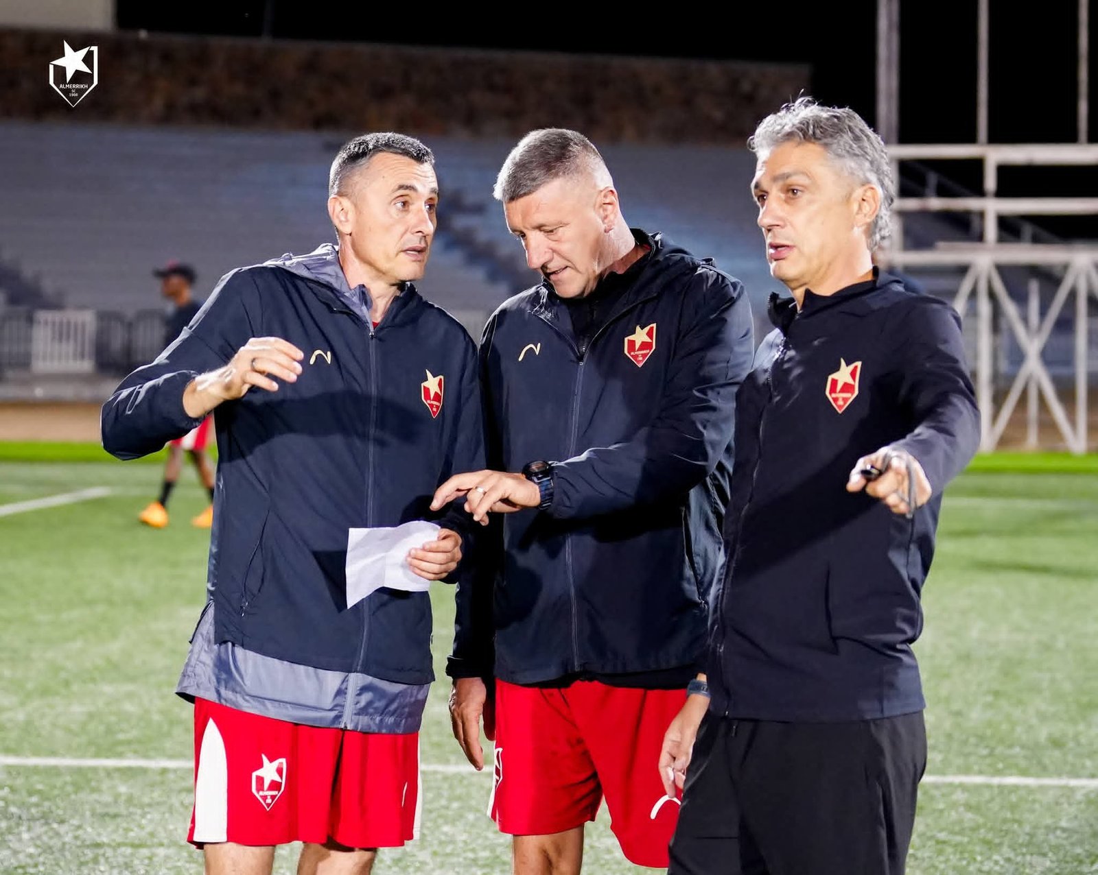 الثلاثي المدرب الصربي داركونوفيتش ومساعده دراغان ساراك ومحلل الاداء دراغان كولوم اجتمعوا قبل بداية التمرين ( كما يظهر في الصورة المرفقة مع الخبر ) للتخطيط للمرحلة المقبلة .