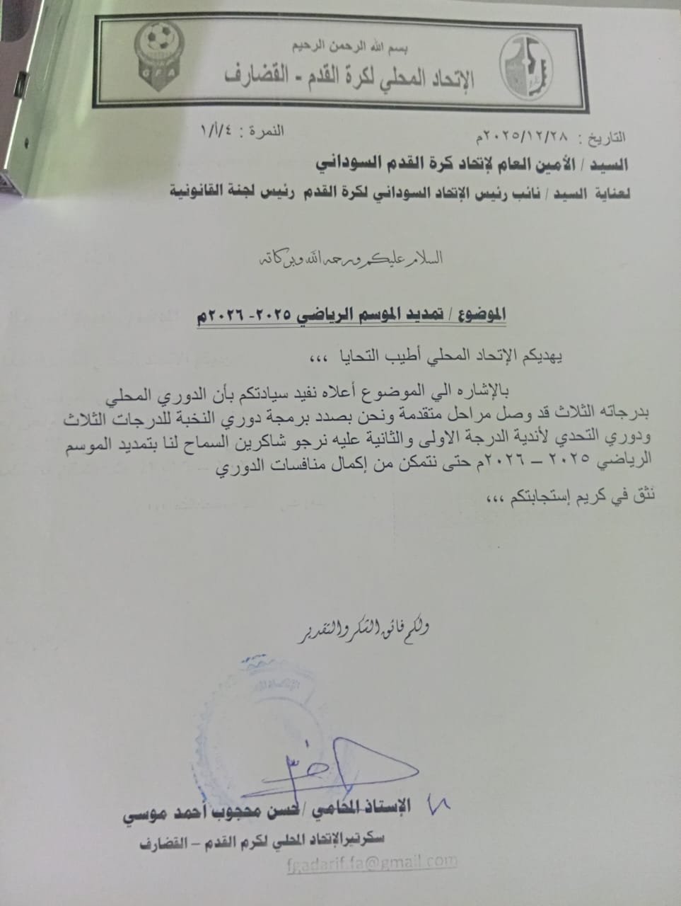 حصل موقع نادينا الالكتروني على طلب اتحاد كرة القدم بالقضارف للاتحاد السوداني لكرة القدم بتمديد الموسم حتى شهر يونيو المقبل بدلا عن 30 مايو الذي كان الاتحاد العام قد حدده لنهاية الموسم بالسودان .